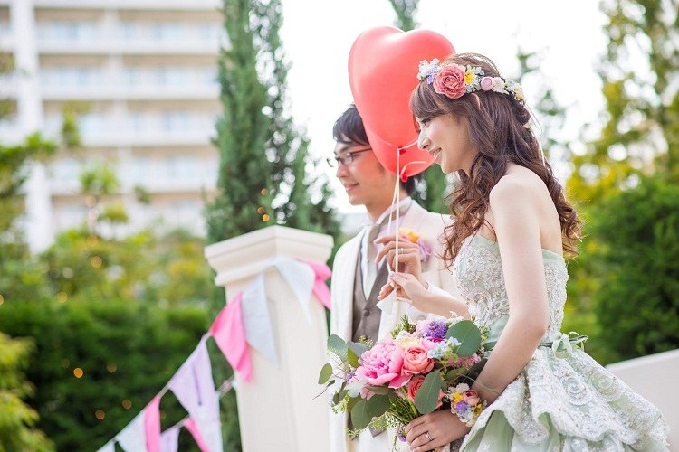 お庭に出てゲストと一緒にバルーンリリースをしました。私たちの結婚式のテーマである「花」にちなんで、ピンクと白のカスミソウの花の種を結んだ風船を飛ばしました。人数が多かったので、一斉に放ったバルーンはかなりの迫力でした。私たちふたりのバルーンはハート型です。このとき飛んで行ったバルーンを受け取ってくださった方、いらっしゃるのかな。
