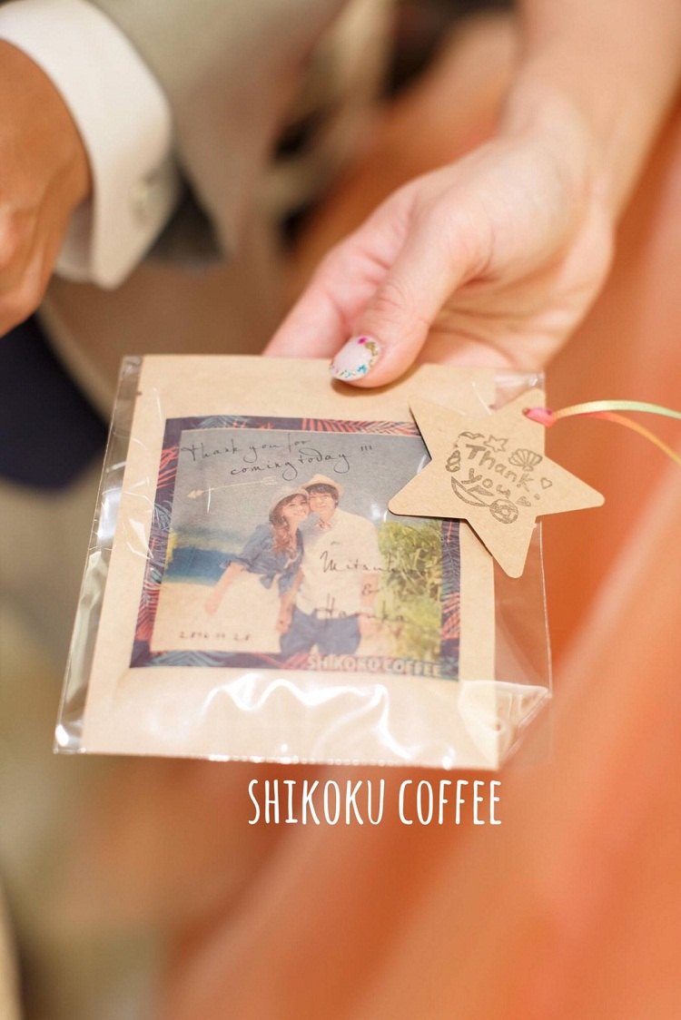 送迎のプチギフトは、オリジナルプリントのできる四国珈琲にしました♪軽くて持ちやすいし、幅広い年代のゲストに渡すことができるのでおすすめのギフトです♪