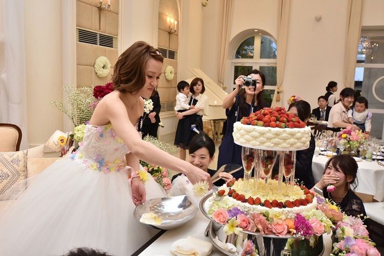 ファミリーウェディングの私たちはお互いのファーストバイトが終わった後、娘にお子様バイトをしました。 長女はイチゴが大好きなので事前に『イチゴ食べたい。ママに食べさせてほしい!』と言っていたので、希望通りイチゴを食べさせました!うちの娘たちはイチゴが大好き♥ケーキ・クリームなしのイチゴのみを食べさせました!しかもヘタ付き…! 後から主人に指摘されて気付いた私(笑)ヘタ付いてるとか付いてないとか全然気にしなかった!ごめーん☆