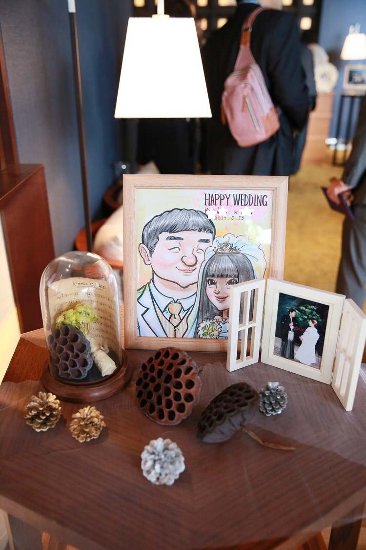 ガラスドームの中、蓮カップのドライフラワーをいれてデコレーションしたものディスプレイ。後ろの似顔絵イラストは神戸に婚前旅行で行った際、「mosaic」の中で描いていただいたものです。 彼そっくりです(笑)!でも彼は不満らしい(´×ω×`)私はちょっと美人に描いてもらいすぎでした(笑)こんなに可愛く描いてもらえて幸せ♡