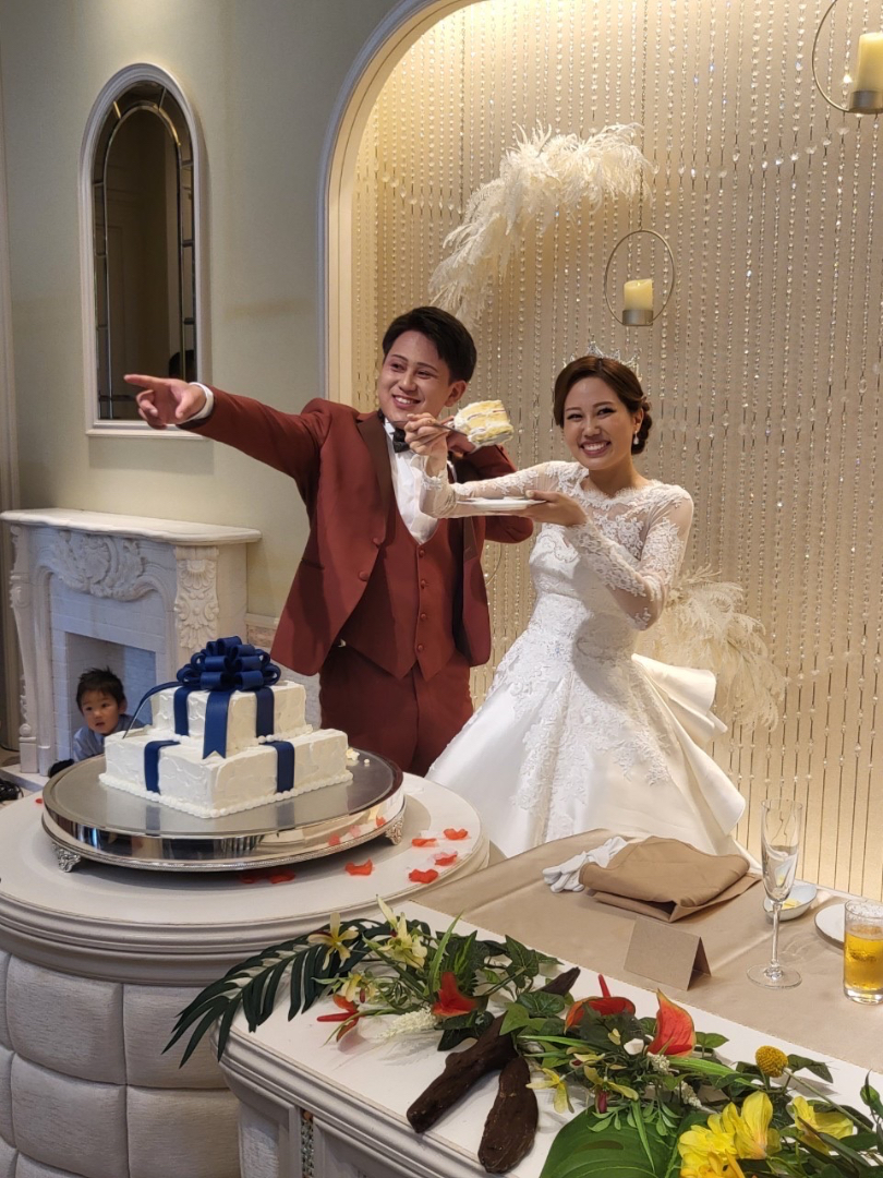 ケーキ入刀とファーストバイトはとにかく楽しく!!新郎新婦ともに大きめのスプーンでたくさんケーキを食べました。