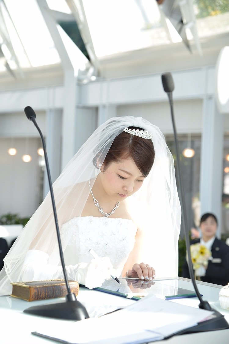 指輪交換同様、グローブをつけたまま署名。あまりおすすめ出来ません(笑)ペンが持ち辛いので、アテンドの方に外してもらうよう相談しておくといいと思います!ペンを持ったり指輪を交換したり、挙式中は細かな動作が意外と多いので、それを踏まえて衣裳の小物を選ぶのもいいですよね。