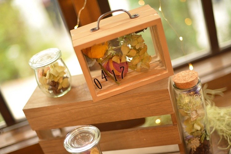 前日に飾ったウェルカムスペース★ガーデンウェディングに合わせてナチュラルなアイテムを集めてみました。ドレスコードのデニムに合わせて作ったデニムガーランド♡♡ いい感じにできました(´・ω・)♡ 文字も一発書きしたものです!その割にはうまくいきました╰(*´︶`*)╯♡木製のドライフラワーケースはフォトフレームを使って作ったもの。全て100円ショップで揃えました。上は取っ手をつけてトランク風にして、おしゃれな感じになったかなー。ほとんどの物を手作りしました☆