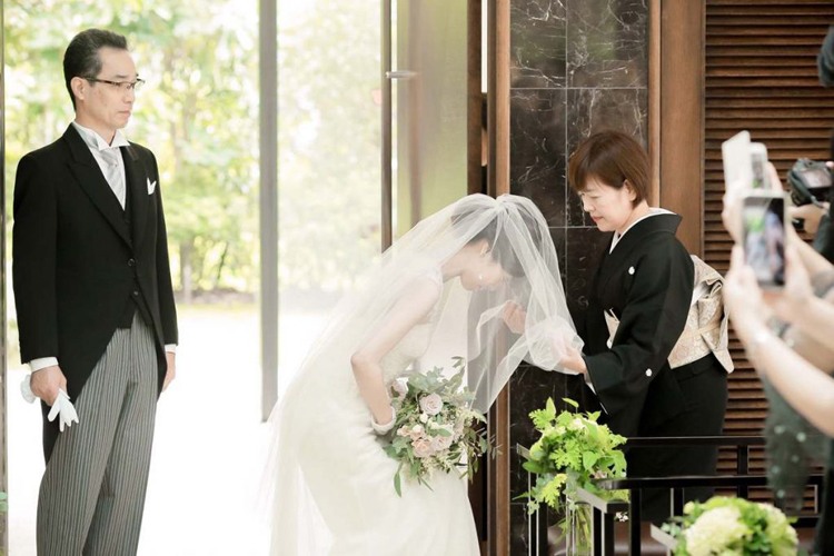 母にベールダウンをしてもらっている時の写真です。先ほどの写真の通り、扉が開いても10秒ほど動かなかった父。「いや、礼をして!」と私が父の腕を引っ張るもやはり動かないままの父。私が礼をして、やっとしょっぱなの礼を忘れていたことに気付いた父の横で、母と私は苦笑していました。父のおかげで緊張感が吹き飛んでしまいました。ベールダウンもあっさり終わったなぁというのが感想です。