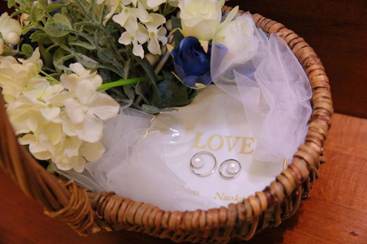 リングピローはテーマに沿ってシェルの陶器♡オーダーで名前もいれてもらいました。指輪を置くところがとっても可愛い!甥っ子と姪っ子にリングガール・ボーイをお願いしたので、割れるのが怖くて…ナチュラルキッチンで買ったカゴに造花やチュールを詰めて持ちやすいようにしました。これは大正解でした!