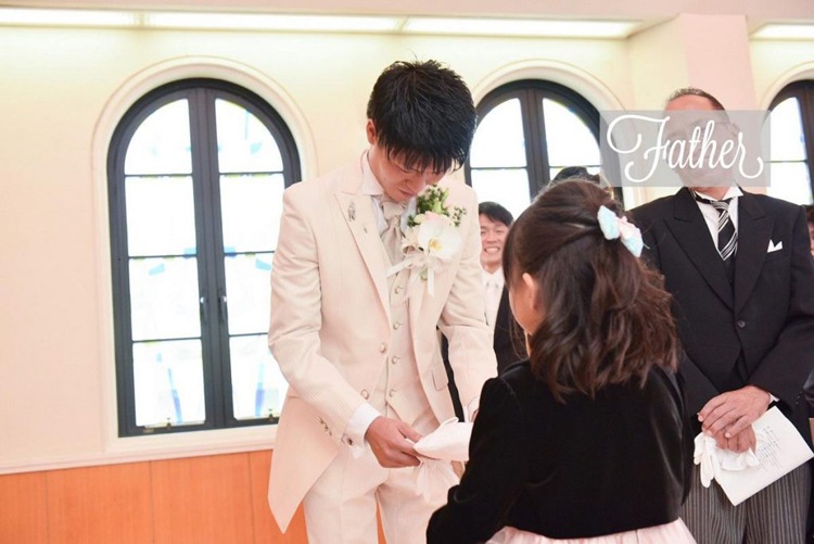 チャペルの祭壇前で新郎と父との対面