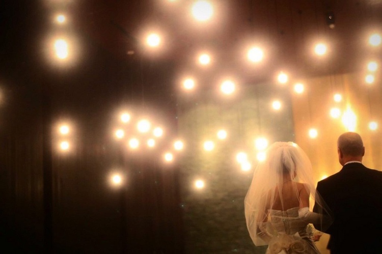 私と彼を見送ったあとの父。涙をこらえている姿だとあとで知って、泣けました。実はこちらのチャペルではカメラマン以外の撮影は基本的にNGです。チャペル内のライティングの演出を最大限に味わうために必要な約束事のひとつでした。ゲストの皆にもご協力いただき、そのおかげで夜空に輝く無数の星の下で結婚式を挙げたような、すてきな空間になりました。