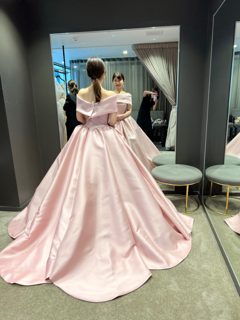 レベッカには淡いピンクと赤などがあります。淡いピンクはブラッシュカラーで、ハツコさんの照明で撮ると黄味かかって見えますが、実際にはもっとピンクです!黒のサッシュベルト有無も選べます。オフショルになっているので、二の腕が隠れて安心感もあり、形が女性らしさを引き立ててくれます!またプリンセスラインのボリュームもすごくありますので、ウェーブ体型の方におすすめなドレスです!