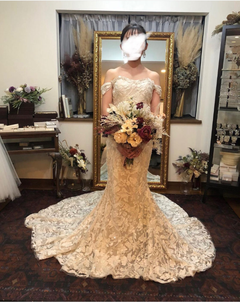 オフショルで刺繍がドレス全体に贅沢に施されていて、