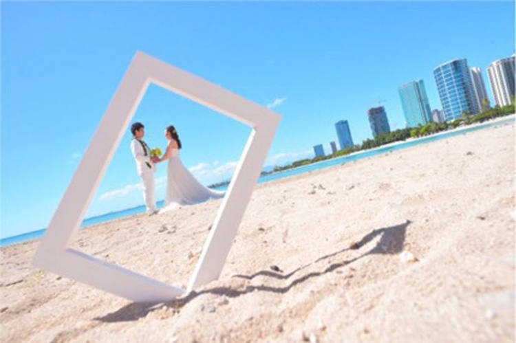 ハワイのビル群も収めつつ、フレームインショットで♪文字を入れたりして加工しやすいのでペーパーアイテムなどにおすすめのショットです。