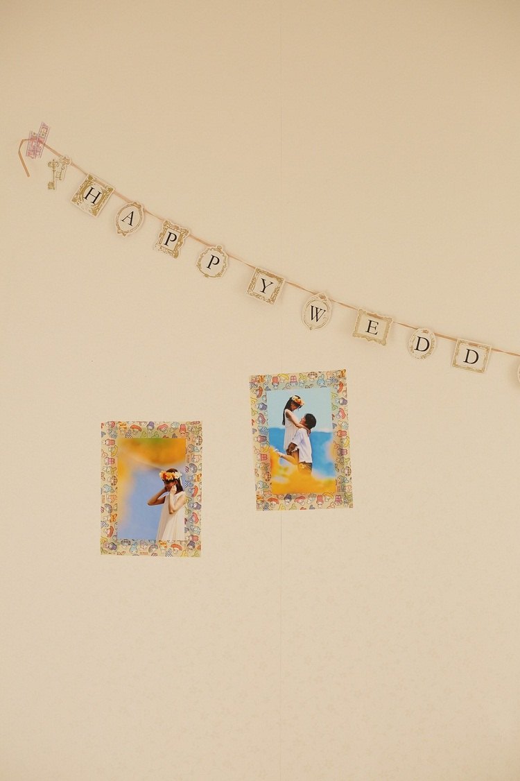 式場の壁にもフォトガーランドを飾っちゃいました♪壁を装飾する際には、貼った跡や傷が残らないマスキングテープならOKと言ってもらいました。それなら!と可愛いマスキングテープを集めてオリジナルのフォトガーランド装飾をしました。マスキングテープは写真を壁に貼るときにももちろん使えますが、写真の四辺にマスキングテープを貼るだけで簡単にフォトフレーム風になりますよ。