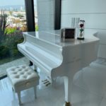 まずコッパースタンドを作成しました。コッパースタンドとネットで調べるととても高かったので、自分達で調べて作ることに決めました。IKEAでハンガーラックを買って、それをホームセンターで買ったゴールドスプレーで塗りました。あとはアクリル板にメッセージを書きました。メッセージを書く時に結構難しかったので、あらかじめパソコンのワードで書きたいものを印刷して、それをうつしました。できたものをハンガーラックに吊して、布とお花を一緒に飾りました。お花に関しては、友達に誕生日の時にもらったパンパスグラスがあったので、それを飾り、あと布は手芸屋さんで買ってきて、一緒に飾りました。存在感があり、とても気に入っています。