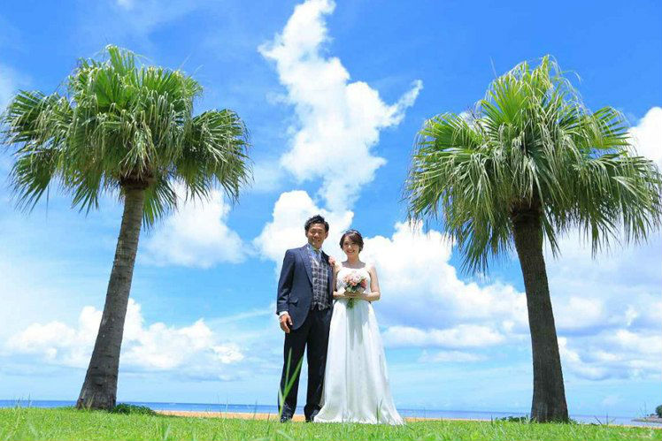 沖縄らしくヤシの木の前で撮った一枚。写真を撮られることに慣れていない旦那はガチガチに緊張していました(笑)爽やかないい天気だったけど、旦那にはちょっと暑すぎたみたいで、まだ撮影が始まって数分なのにすでに汗だく…。