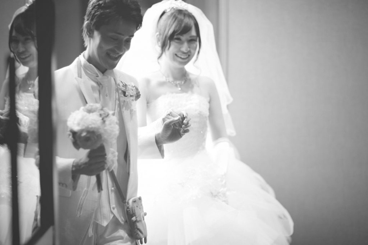 メイクルームからの移動中。あえてのモノクロに加工されたエスコート写真はおしゃれで素敵な1枚。ずっと新郎が優しく手を添えて少し前をゆっくり歩いてくれました。お姫様のようにエスコートしてもらえて嬉しかったです。自然な表情が出やすい移動中はカメラマンにとって絶好のシャッターチャンス!気は抜けないけれど、移動中も楽しかったことを思い出す1枚です。