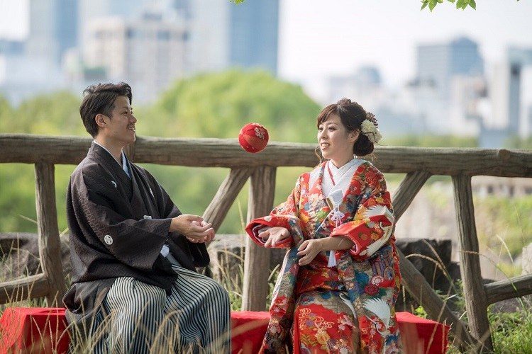 結婚式は都内で行う予定でしたが、和装での撮影は主人の地元である大阪でしたいと思っていました。大阪での前撮りをいろいろ調べていたら、大阪城でロケーションフォトを行っている「神社結婚式.COM」に出会い、すぐに連絡。素敵な衣裳とも出会え、手作りアイテムもたくさん持参で臨んだ前撮りでした。しかも、リーズナブルで素敵な写真を撮っていただき、とっても楽しい撮影でした。