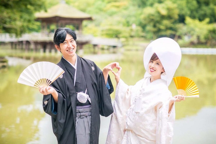 白無垢正統派ショットです♪これは、奈良公園内にある浮御堂をバックにして撮った写真です。和装と背景がバッチリで年賀状にも使用したお気に入りの一枚です。ふたりの表情も穏やかで幸せそうな雰囲気が見てとれるのもポイント♪