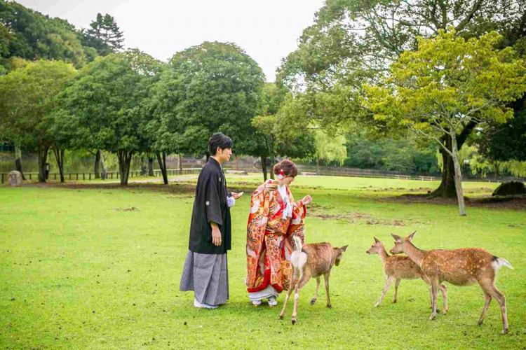 撮影業者はスタジオゼロです。ドレスも色打掛も挙式で着たかったのですが時間も費用もかかってしまい、ゲストとの時間を沢山取り入れることができなくなってしまうので、前撮りで和装をすることにしました。今は東京に住んでいますが、私たちが出会ったのは私の出身地でもある奈良でしたので、奈良公園で前撮りをしました。入籍日に前撮りができたこと、一度は着てみたかった和装で、奈良でしかできないであろう鹿とのショットも撮ることができて、大満足の前撮りとなりました。