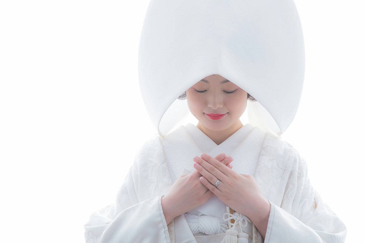 色打掛も好きですが、白無垢はとても神聖な気持ちになれ、取り入れて良かったなと思います。ネイルは白無垢にも合うように、白系のシンプルなフレンチにしました!左手の薬指に赤くリボンをいれたのがポイントです。