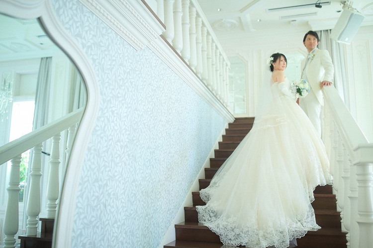 場所を変えて披露宴会場で。ここには階段があるので階段を使った1枚。これも当日には絶対撮れない前撮りならではのショットです!当日は撮れない場所を存分に使えるのも前撮りのいいところ。階段での撮影は、ドレスのトレーンがとても綺麗に見えますし、周りの白い壁さえも新郎新婦を引き立てるアイテムに見えてしまいます♪ドレスの全体が見える写真は必ず何枚か押さえておきたいですよね。