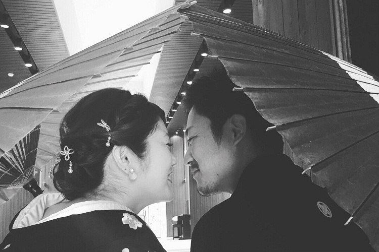 番傘を使った見つめ合いショット。モノクロにして、雰囲気ある一枚に仕上げました。これは麗風つくばシーズンズテラスのチャペルの中で撮影したものです。天井のライティングがいい感じで写真の背景として写りこんでくれています♪