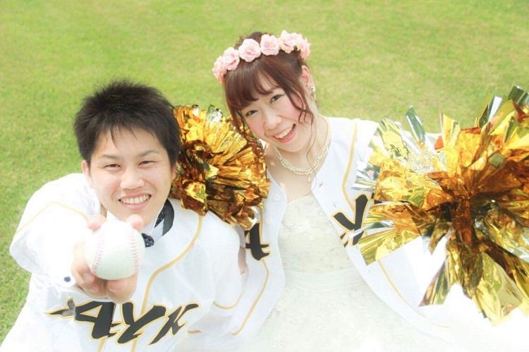 彼の所属する野球チームのユニフォームを着て撮影しました!手に持ったポンポンは手作りです!チアリーダーのような派手でキラキラのポンポンにしました♪